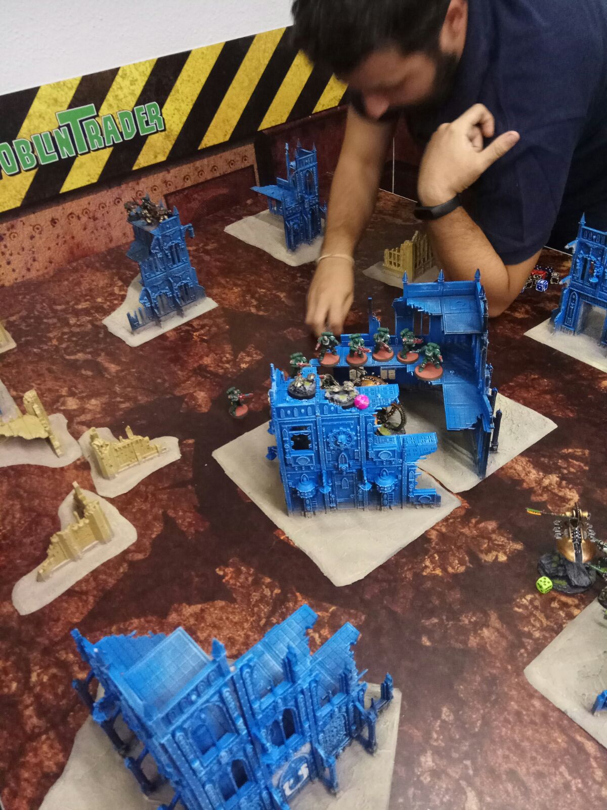 El escenario consistía en tomar una reliquia en el centro de la mesa y, como me enteré al final, en matar unidades. Me concentré en un flanco y decidí maldecir un Leman y concentrar el fuego en él, táctica que me sirvió para bajarme dos Leman y dejar los otros dos tocados.