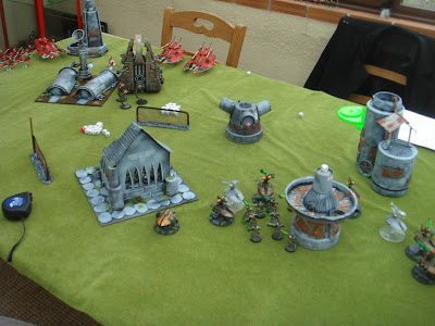 En su turno, Tulark avanzó todo lo que pudo sus destructores, escondiendo a los guerreros tras el edificio al ver que no llegarían al combate al menos que fuera yo buscarles. Los destructores pesados apenas pudieron aturdir a un prisma, y perdí un par de motos de la primera escuadra bajo el fuego de los Destructores "ligeros". El monolito usó su matriz para meter un plantillazo a los Vengadores que acabo con la mitad, aunque el Exarca se salvo de milagro.