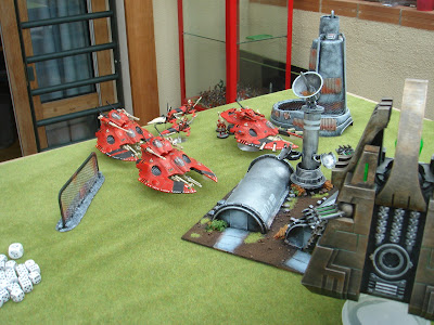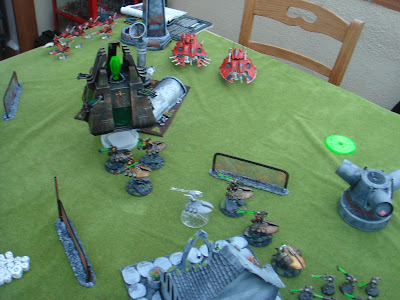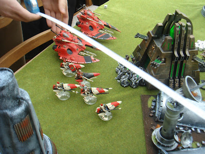 Mis motos se dividieron para dar cobertura a los dos grupos de tanques, unas a toda velocidad para obtener la invulnerable de 3+, mientras la primera escuadra avanzaba para disparar los cañones Shuriken, no hacer nada, y dar marcha atrás. El prisma restante disparó sobre el monolito, y milagro, lo dejo aturdido.